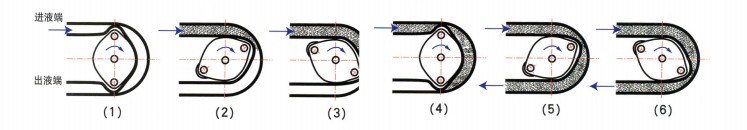 一、概述 FRU系列軟管泵是一種容積式泵,具有轉(zhuǎn)速低、效率高、無噪音等特點(diǎn),用途非常廣泛。其工作原理是:一對滾輪在充滿潤滑油的泵腔內(nèi)轉(zhuǎn)動,滾輪和泵殼腔壁一起擠壓著軟管,將軟管壓扁。隨著滾輪的轉(zhuǎn)動,軟管被壓扁的地方也逐漸從泵的進(jìn)液端向出液端移動。在此過程中,進(jìn)液滿的軟管在自身彈性作用下逐漸恢復(fù)原狀,容積變大,從而產(chǎn)生真空將物料吸入,出液端的軟管逐漸被擠壓,容積變小,從而將物料強(qiáng)行排出,如此周而復(fù)始,物料就不斷被吸入和排出(如下圖),該泵的適用溫度為≤80℃。 二、工作原理