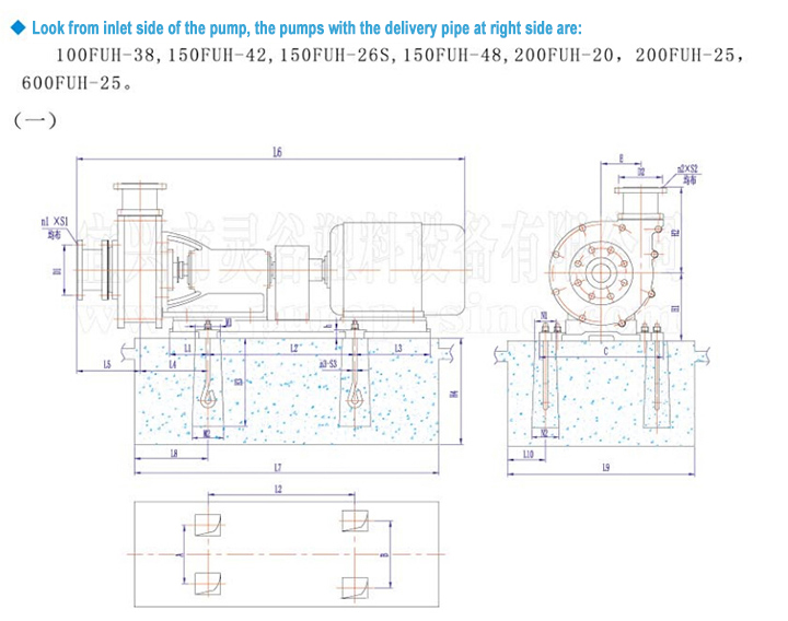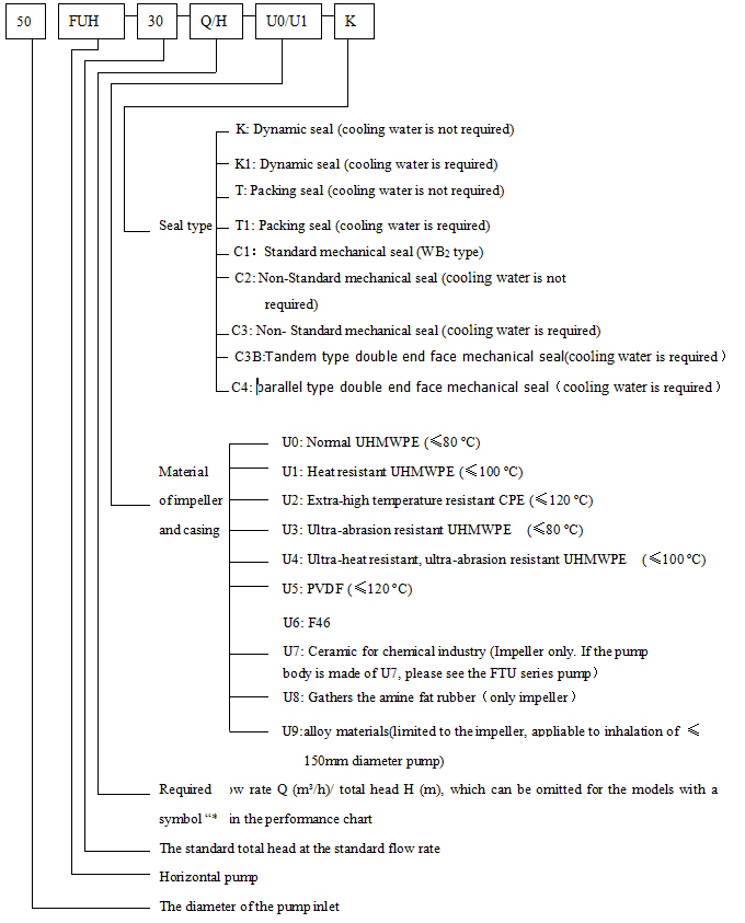 The FUH series pumps are widely used for pumping liquids such as acid, alkaline, salts, oil, beverages and wine, whatever the liquids are clean or containing solid particles. In nonferrous metal industry, especially the pumps can be used for pumping various acids, electrolytes, sewages, ore magma or other serous materials in the hydro-metallurgical process for lead, zinc, gold, silver, copper, cobalt, tungsten and rare earth, for pumping diluted acid (pickling acid), parent liquid, hydrofluoric acid, fluoro-silicon acid, sea water and phosphoric acid in chemical fertilizer industry, for pumping different sewages in the food industry, electric planting factories, leather treatment factories, medicine industry, paper making industry, textile industry and electronic industry; for pumping sulphuric acid or hydrochloric acid in the iron and steel industry, used in the acid catalysed cleavage, settling, refrigeration, hydrologic, water washing, salts treatment process in titanium dioxide pigment industry, used in the fermentation, neutralizing, pressure filtration, water treatment in citric acid factories. The UHMWPE pumps are first selection of the alternatives of the imported pumps and other similar metal or non-metal pumps made in China.