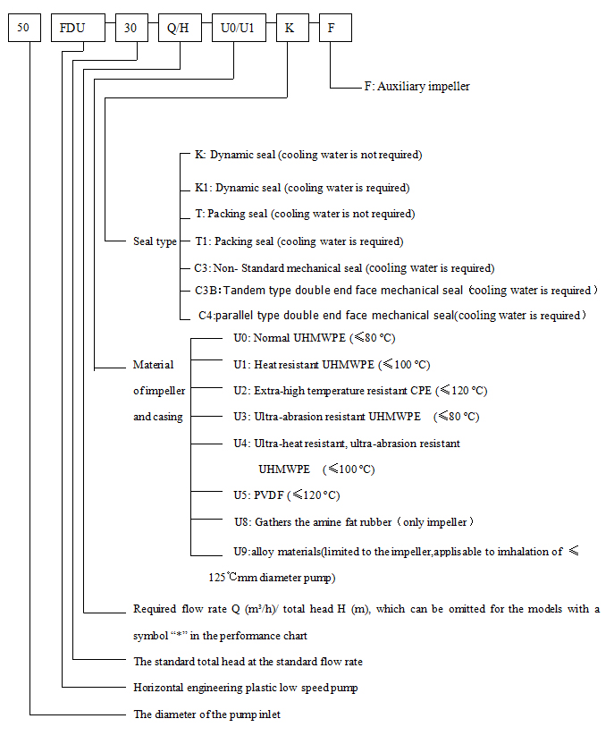 The FDU series pumps are mainly used for pumping different kind of liquids such as acid, alkaline, salts, oil, beverages and wine. They are widely used in chemical industry for pumping acid, alkaline, salts, oil and different kind of liquids, whatever the liquids are clean or containing solid particles; used in nonferrous metal industry, especially in the factories producing lead, zinc, gold, silver, copper, cobalt, tungsten and rare earth etc for pumping various acids, ore magma, slurry (for pumping slurry to filter press) electrolytes, sewages; used in fertilizer industry for pumping diluted sulphur acid, parent liquid, hydrofluoric acid, fluoro-silicon acid, sea water and phosphoric acid slurry; used for water treatment or environment facilities for pumping different kind of sewages(sewage from food industry, electroplating industry, leather industry, medicine industry, paper making industry, textile plant and electronic industry etc.); used in the acid catalysed cleavage, settling, refrigeration, hydrologic, water washing, salts treatment process in titanium dioxide pigment industry; used in acid station in the chemical fiber industry; used in the fermentation, neutralizing, pressure filtration, water treatment in citric acid factories; used in manganese industry. The UHMWPE pumps are first selection of the alternatives of the imported pumps and other similar metal or non-metal pumps made in China.
