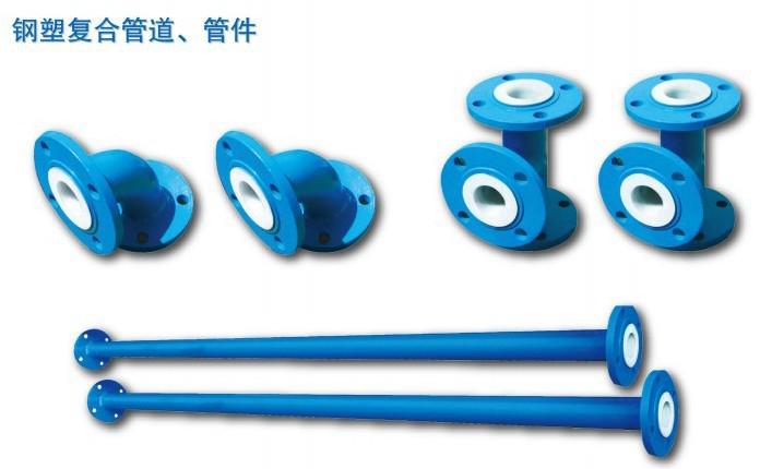 Steel plastic composite pipeline and pipe fitting are manufactured with metal thin walled tube and engineering plastic. It has high strength and rigidity, and excellent corrosion resistance.